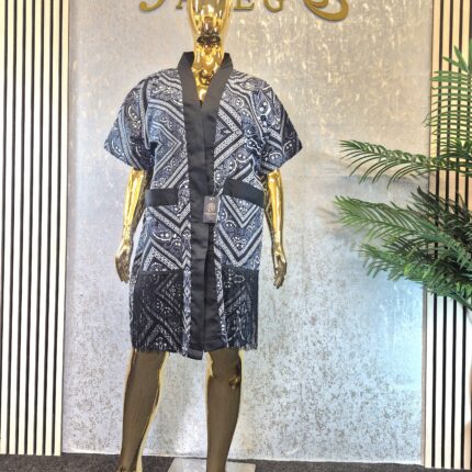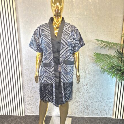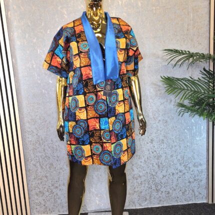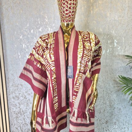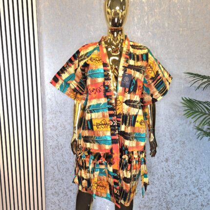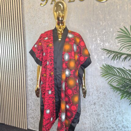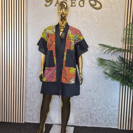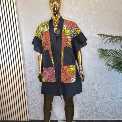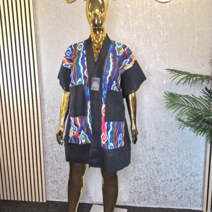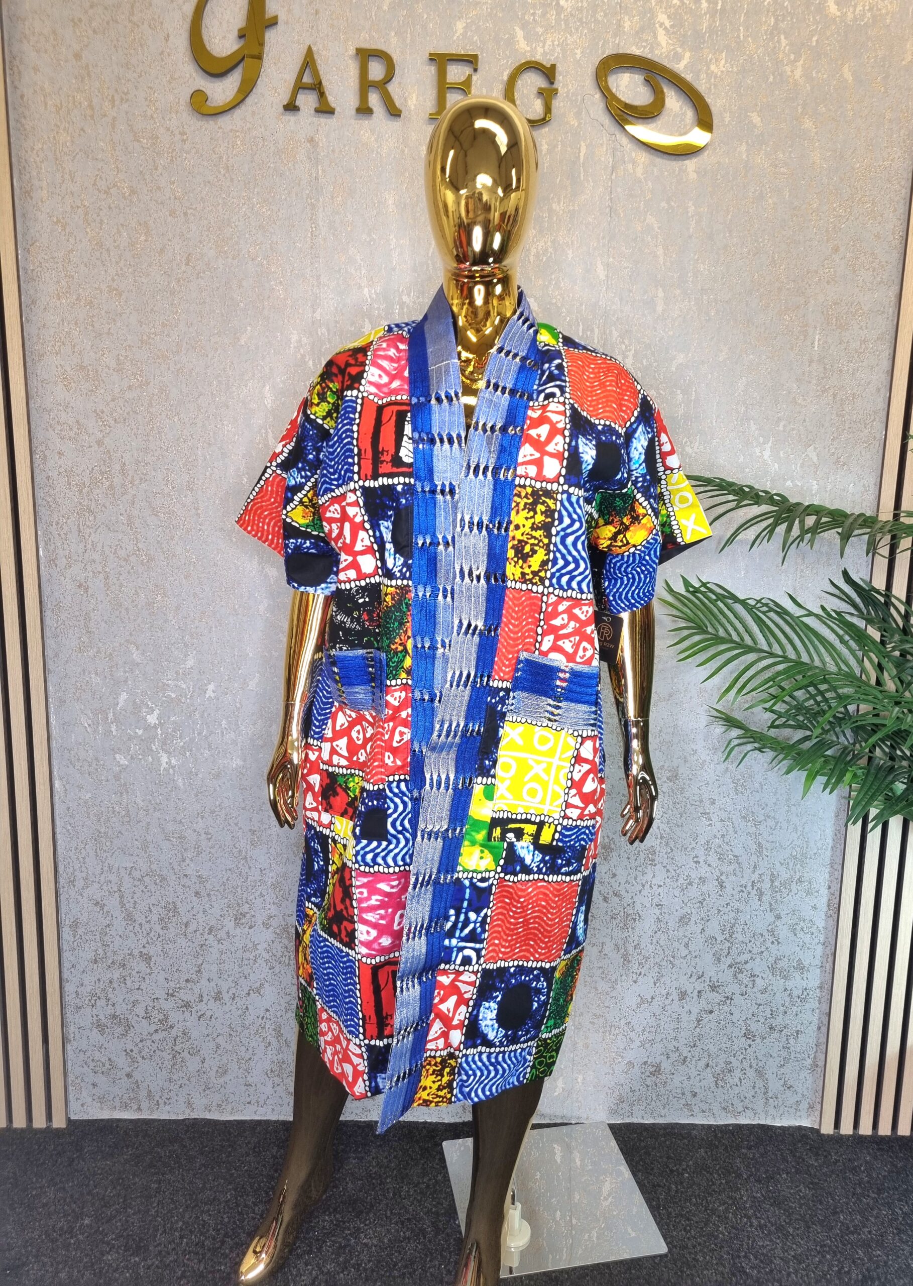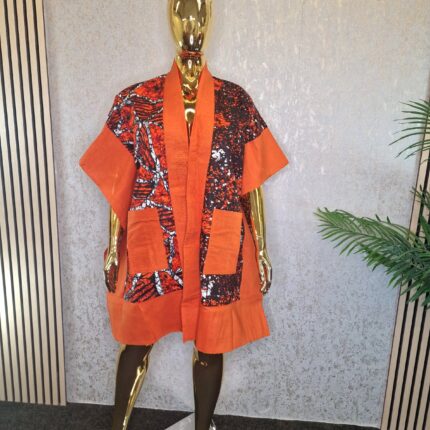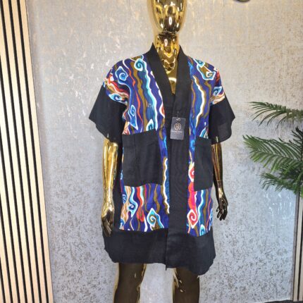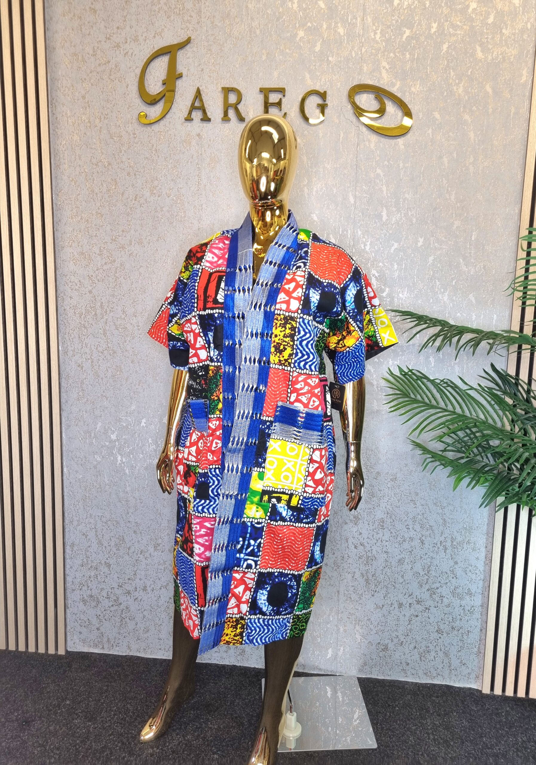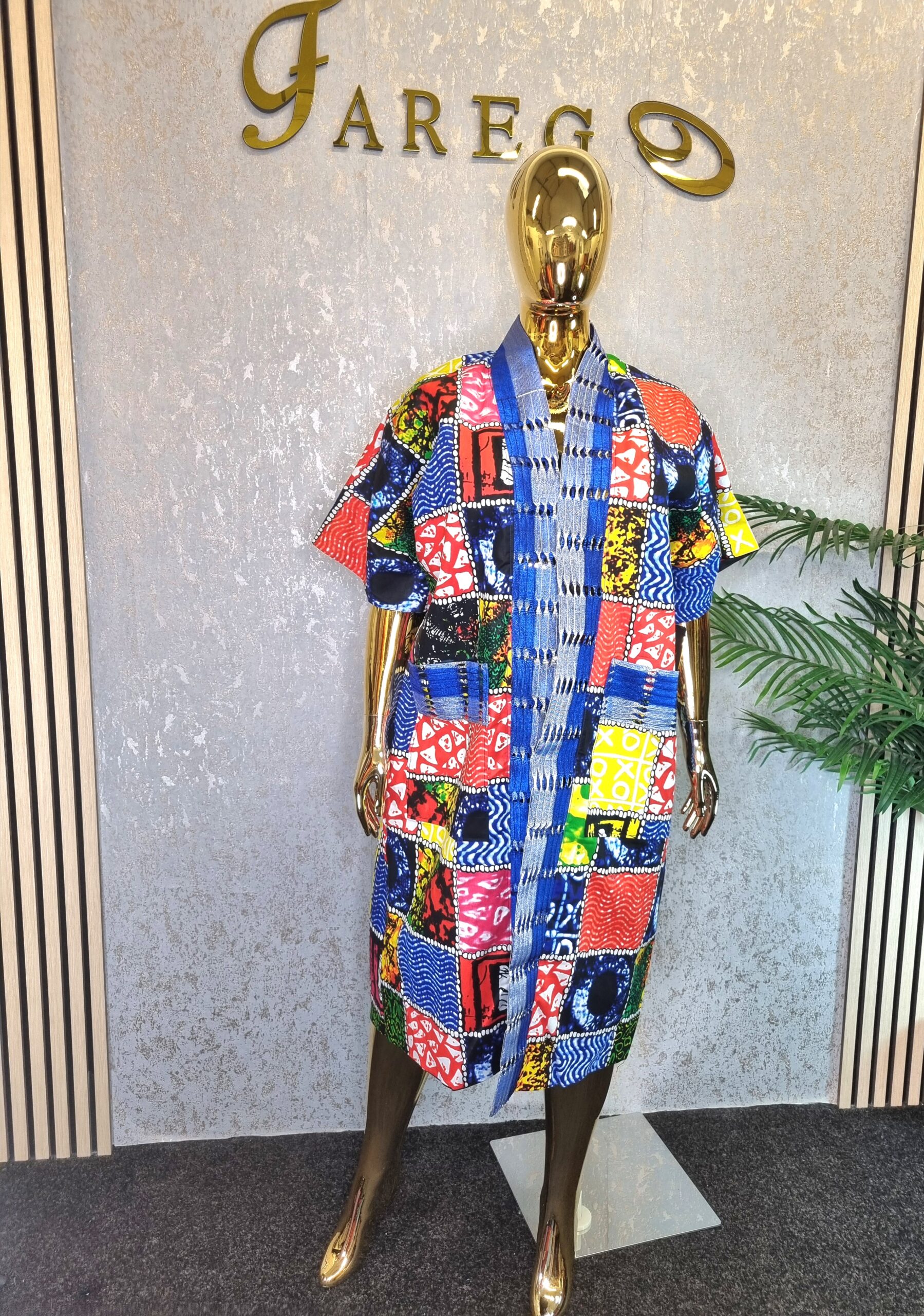 This kimono is made with a mixture of colourful Ankara and quality aso oke. Turn heads with it’s patterns and gorgeous stand-out colours.