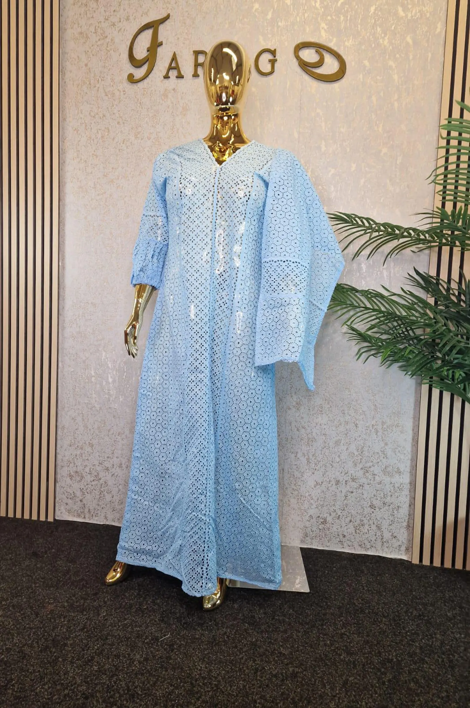 This Lovely dry lace can be worn any time, any place and any wear. Its a kaftan classy dress which is very flattering to any body shape and will keep you looking sleek, modern, elegant and chic at any occasion. Has a front slit for ease of walking.