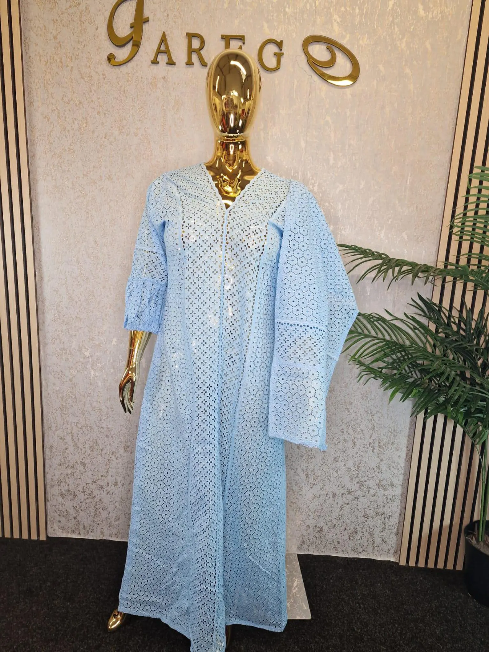 Blue African Lace Kaftan Dress with Head Scarf