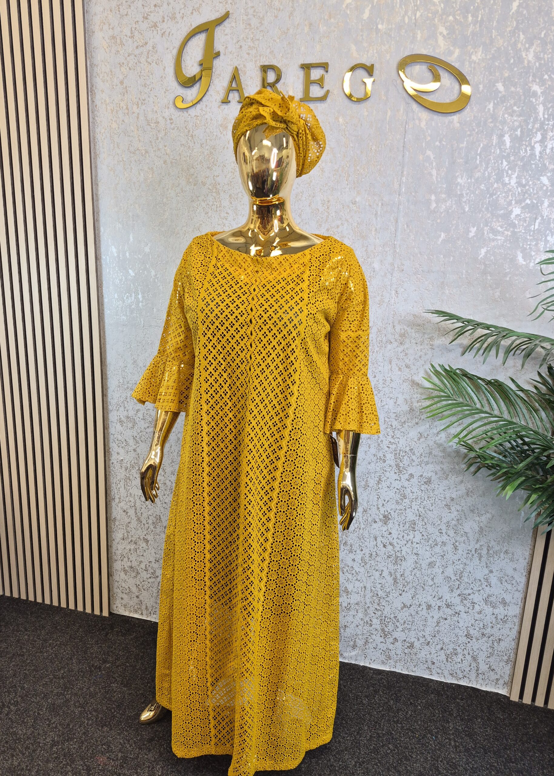 This mustard yellow African dry lace Kaftan dress comes with a head scarf, offers a sleek, modern, elegant, and chic look for any occasion. The loose, flowing silhouette is very flattering to any body shape, and the front slit ensures ease of walking.