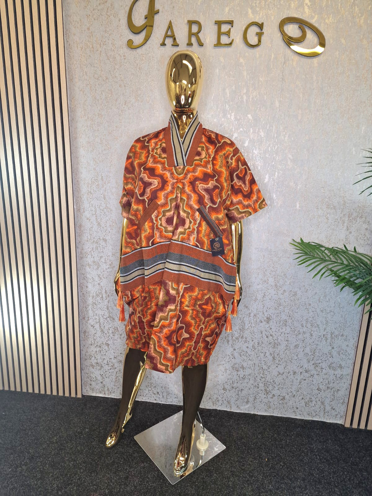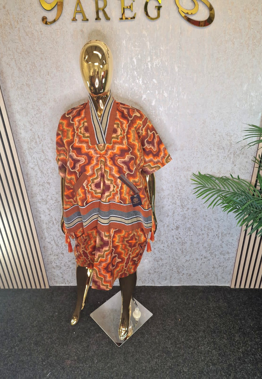 This beautiful short Kaftan dress, featuring a V-neckline and convenient side pockets, is a versatile and stylish piece perfect for a range of occasions, from cool summer weather to elegant special events.