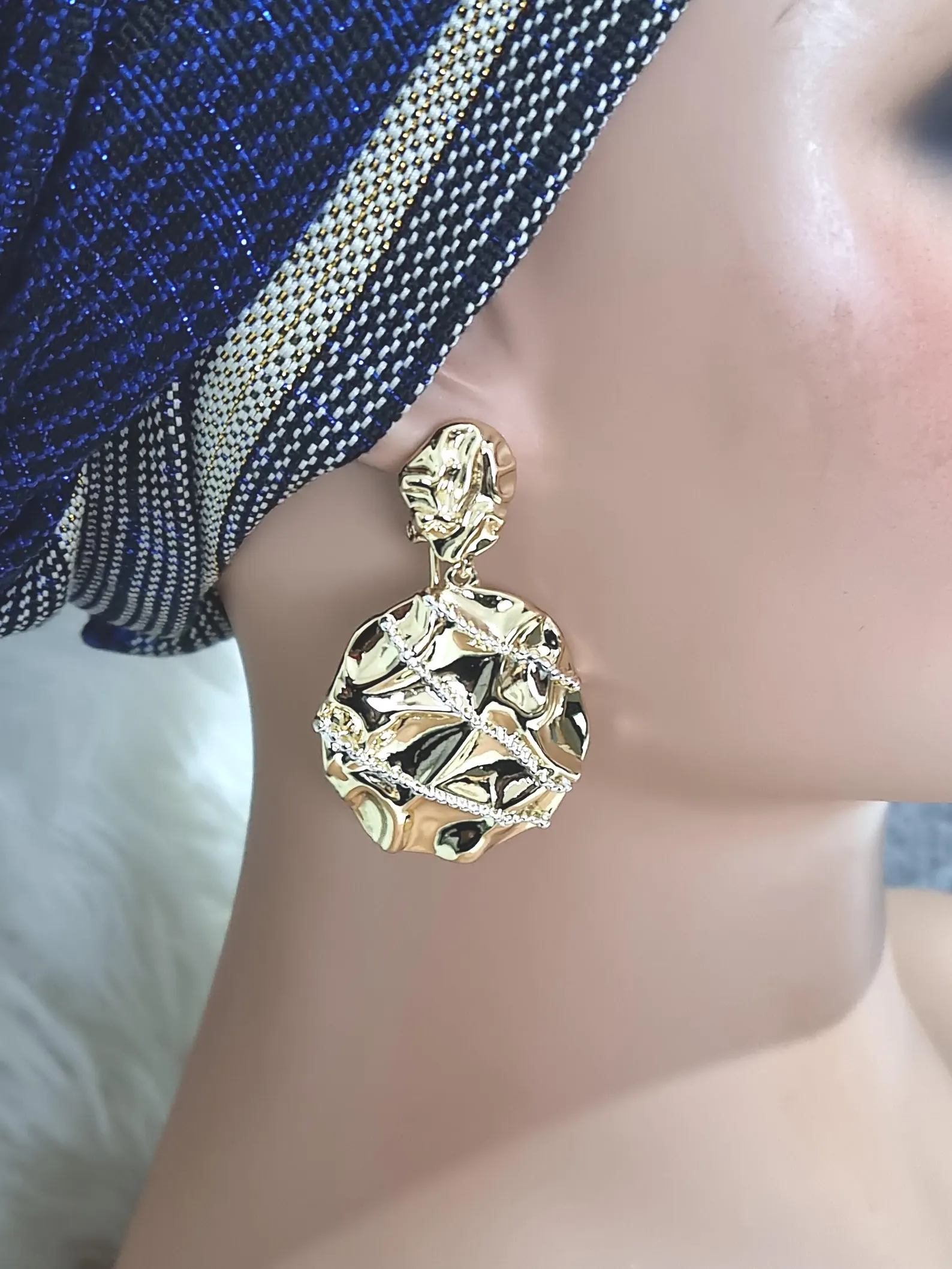Beautiful large gold and silver tone earrings with elegant design. Earrings size: 5.5cm length, 3.5cm width. The earrings come with push backs for pierced ears and are made in a high-quality copper alloy, which is gold-plated.