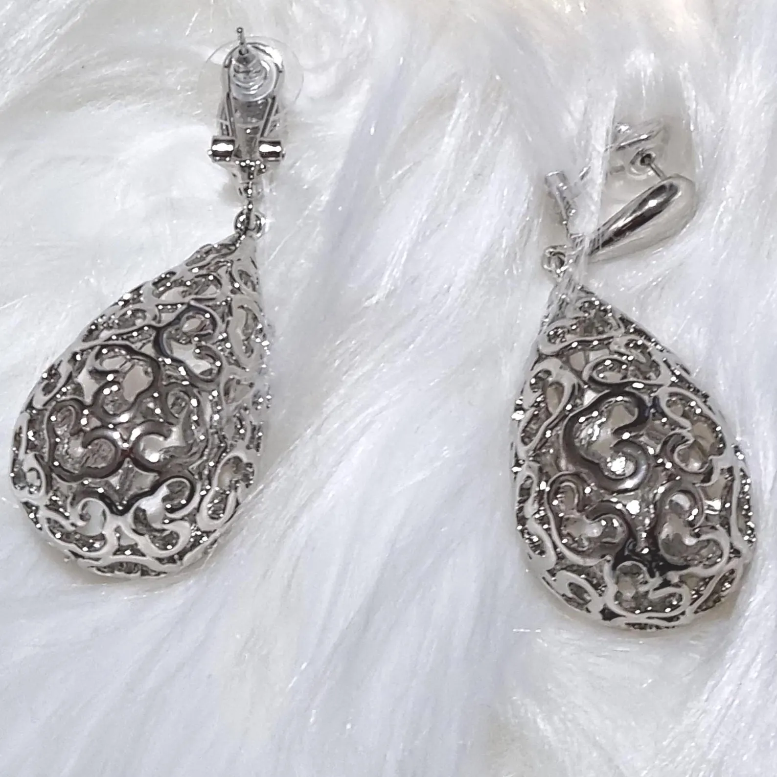 Beautiful silver earrings with elegant design. Earrings size: 6cm length,2cm width. The earrings come with latch backs for pierced ears and are made in a high-quality zinc copper alloy, which is silver-plated.